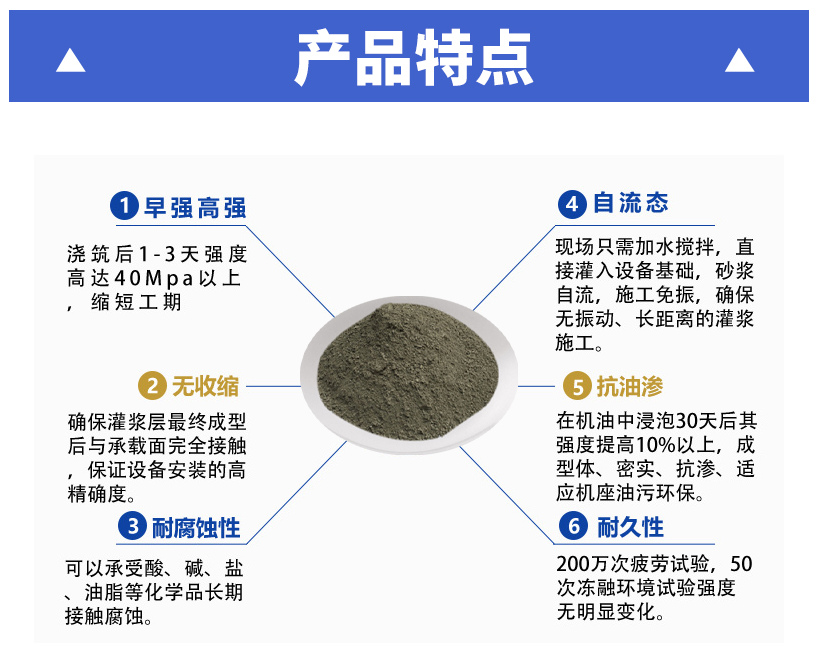 高強(qiáng)無收縮灌漿料主要用于:地腳螺栓錨固、飛機(jī)跑道的搶修、核電設(shè)備的固定、路橋工程的加固、