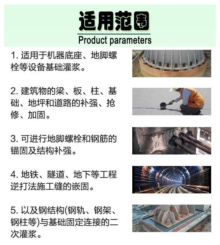 機(jī)器底座、鋼結(jié)構(gòu)與地基懷口、設(shè)備基礎(chǔ)的二次灌漿、栽埋鋼筋、混凝十結(jié)構(gòu)加固和改造,舊混凝土結(jié)構(gòu)的裂縫治理,機(jī)電設(shè)備安裝,軌道及鋼結(jié)構(gòu)安裝,靜力壓樁工程封樁,建筑加固,梁柱截面加大、墻體結(jié)構(gòu)的加厚及漏滲水的修補(bǔ),各種基礎(chǔ)工程的塌陷灌漿以及各種搶修工程等。